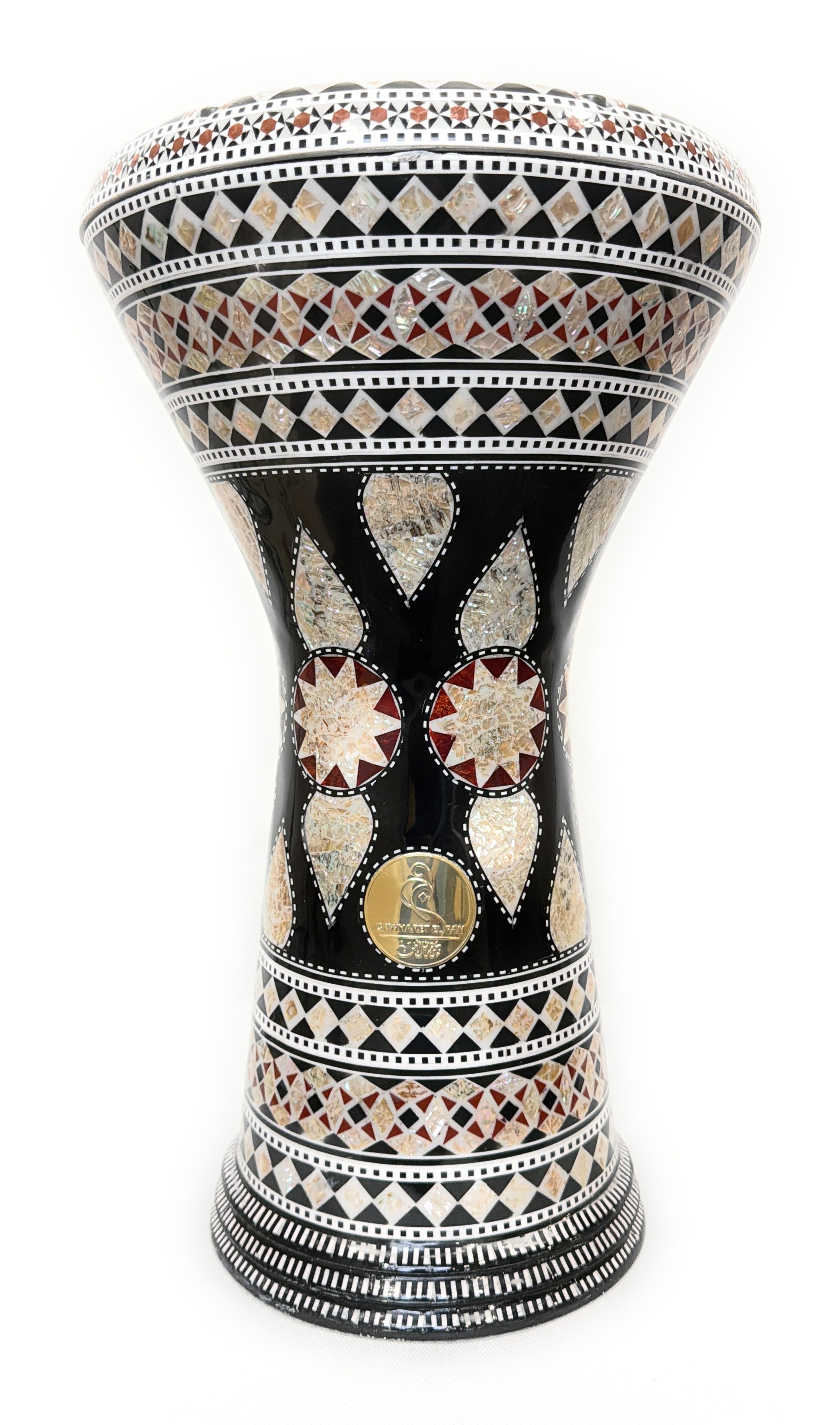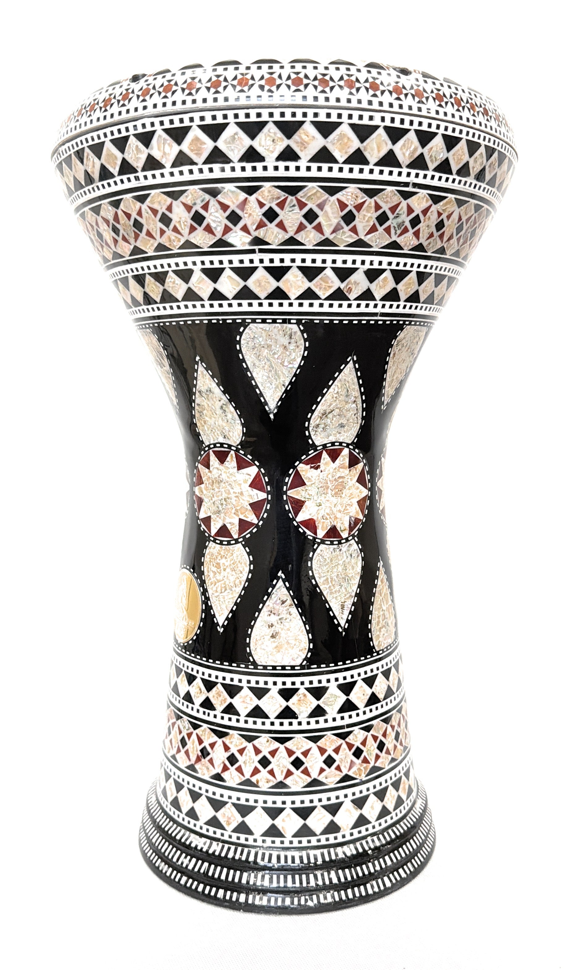Each darbuka is handcrafted in Egypt using natural mother of pearl by skilled artisans. Subtle variations in pattern, tone, or finish are a natural part of the authentic, artisanal process, making every instrument visually unique. Minor aesthetic variations or small surface artifacts may be present and reflect the individuality of handcrafted work; they do not affect sound quality or performance.